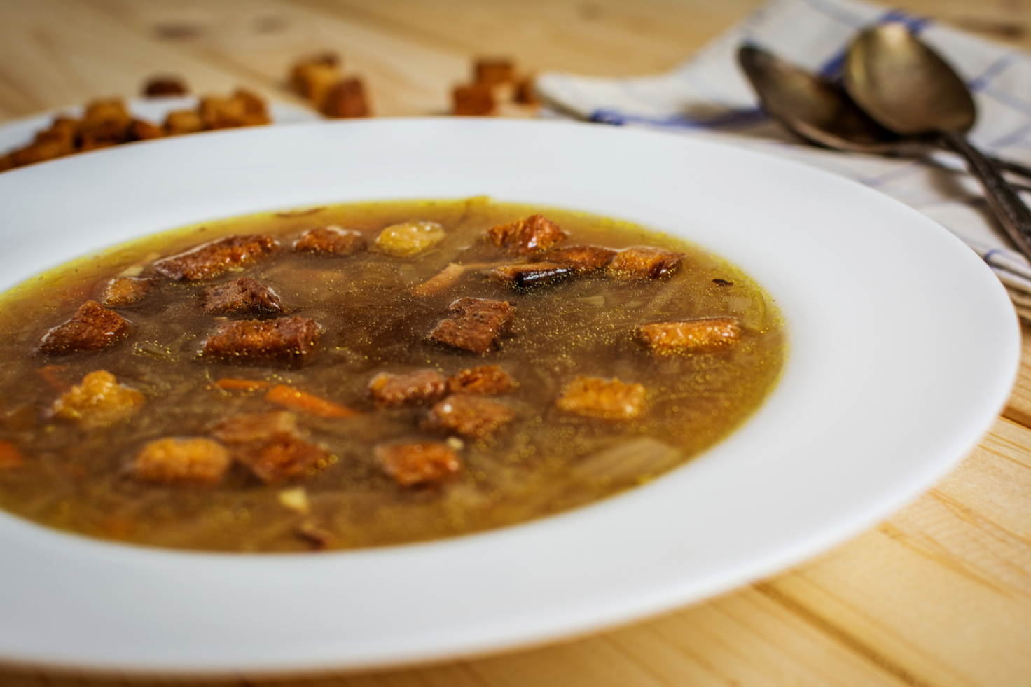 And now for the twist: Gratineed Onion Soup. Butter a large ovenproof tureen (or smaller individual tureens). Place a layer of croutons in the tureen. Cover with about 1/4 lb sliced Swiss cheese, pour in the soup, top with more croutons and sprinkle with 1 cup grated Swiss cheese combined with 1/4 Parmesan cheese. Drizzle with a tbsp of melted butter or olive oil. Bake at 425 degrees Fahrenheit for 30 minutes.